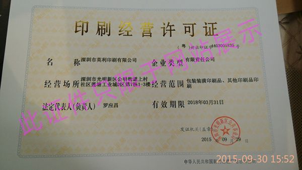 产品名称: 英利印刷经营许可证 |